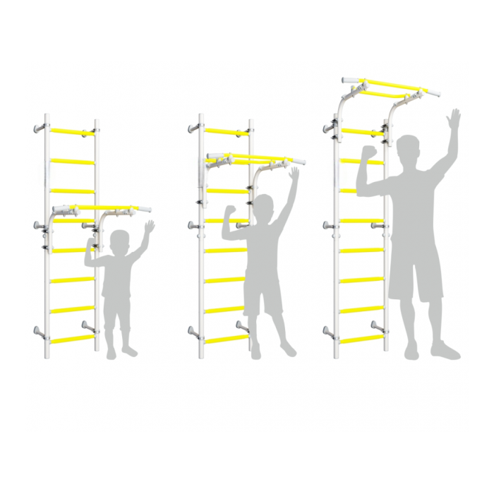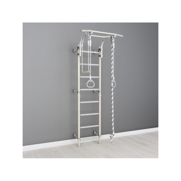 Tegu on pastellvalget värvi seinale kinnitatava võimlemisredeliga, millel on hallid massaažifunktsiooniga astmed ja korralikud reguleeritava kõrgusega seinakinnitused. See kinnitussüsteem väldib rööbaspuu seinal olevas elektrijuhtmestikus või õõnsustes kinni jäämist.